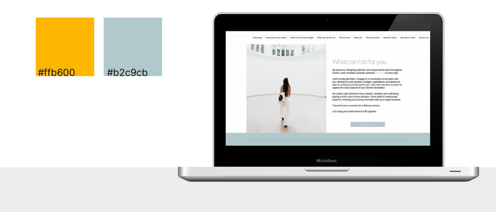 La cornice rettangolare aggiunge struttura ma resta aperta, simbolo di viaggi su misura che rispettano la libertà del viaggiatore. ‘Travel design’ in minuscolo contrasta con le maiuscole di ‘VIOMA’, evocando un approccio morbido, essenziale ed elegante: ciò che conta è l’esperienza di viaggio (il vioma) senza fronzoli, ma con eleganza e cura.